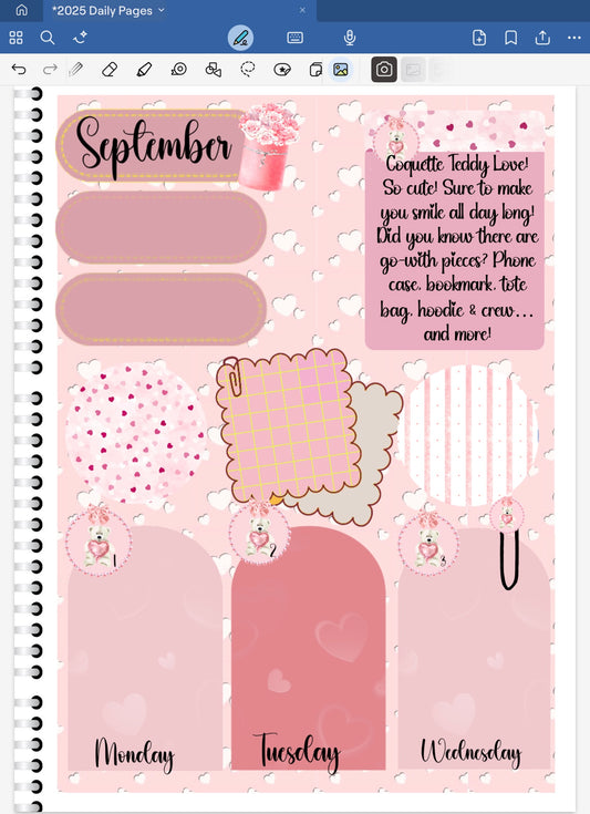 Coquette Teddy Love! Days Of The Week/Months Of The Year Digital Pre-Cropped Stickers For Goodnotes (7700-DM)