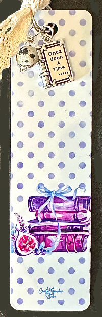 Fun, stylish and unique aluminum bookmark. Cheery "Once Upon A Time" book charm and a Dalmation Jasper bead. Tied with a vintage-inspired cotton lace ribbon. 1.25" x 4.75"