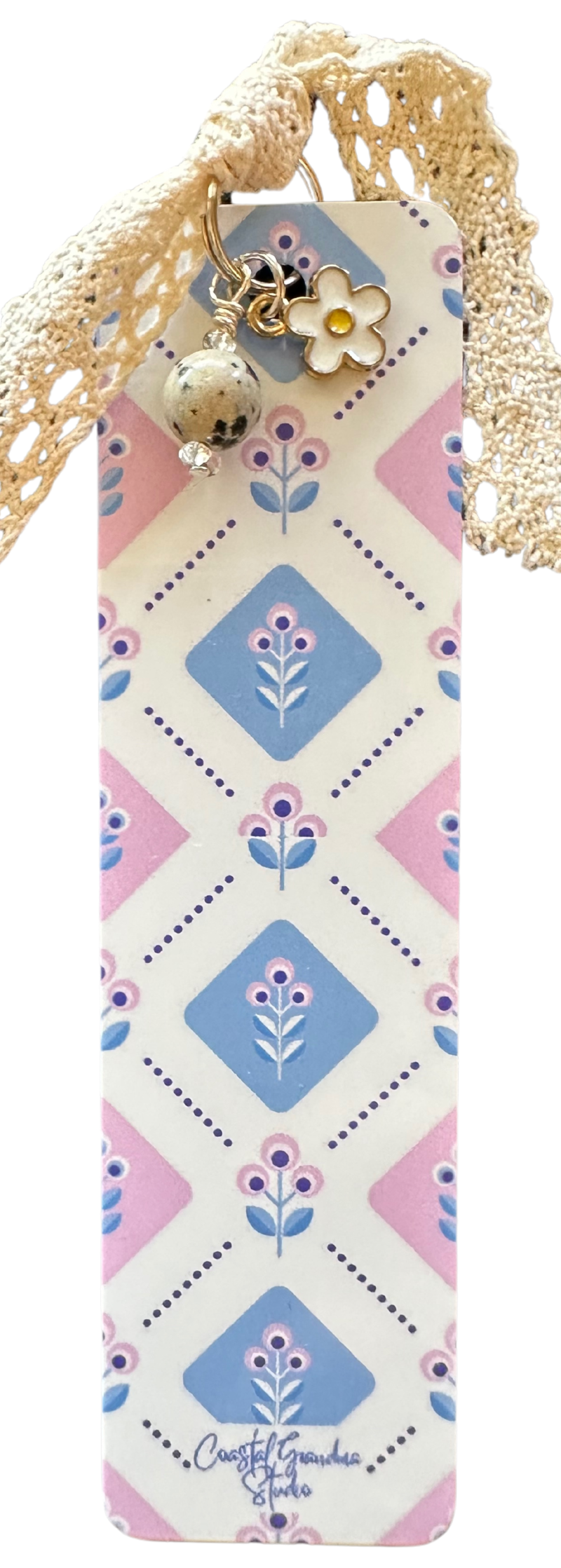 Fun, stylish and unique aluminum bookmark. Cheery flower charm and a Dalmation Jasper bead. Tied with a vintage-inspired cotton lace ribbon. 1.25" x 4.75"