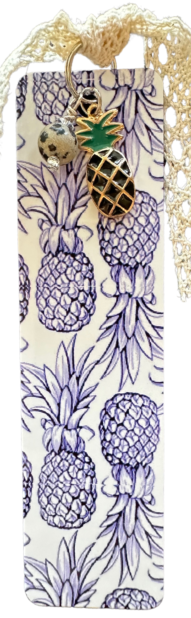 Fun, stylish and unique aluminum bookmark. Cheery enamel pineapple charm and a Dalmation Jasper bead. Tied with a vintage-inspired cotton lace ribbon. 1.25" x 4.75"