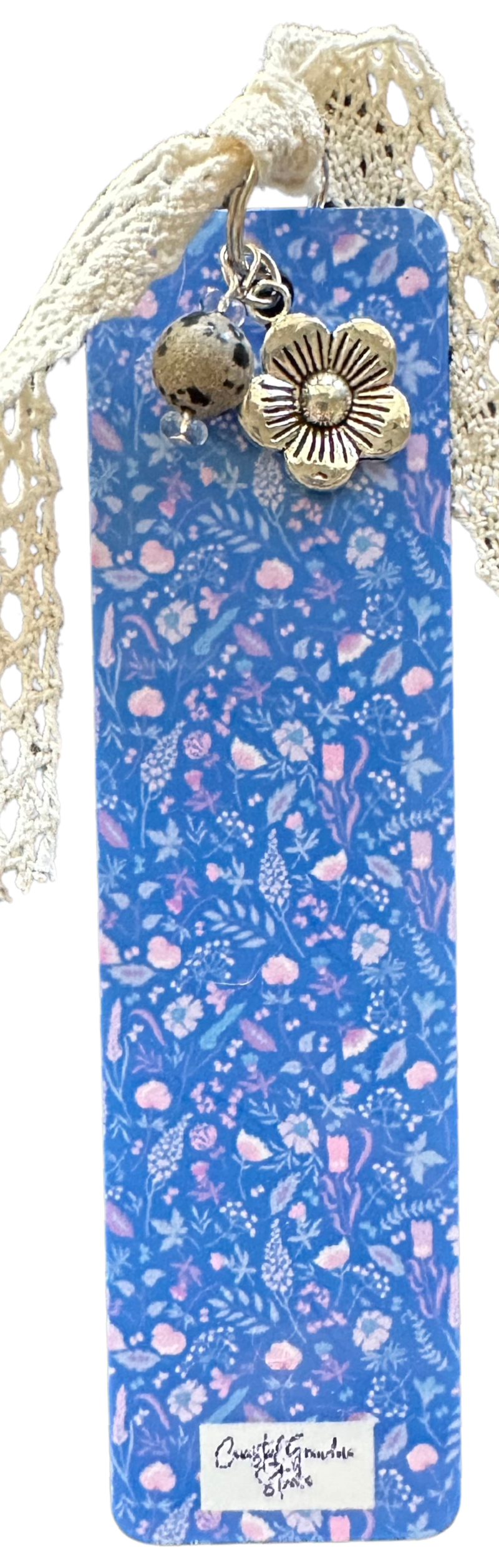 Fun, stylish and unique aluminum bookmark. Cheery flower charm and a Dalmation Jasper bead. Tied with a vintage-inspired cotton lace ribbon. 1.25" x 4.75"