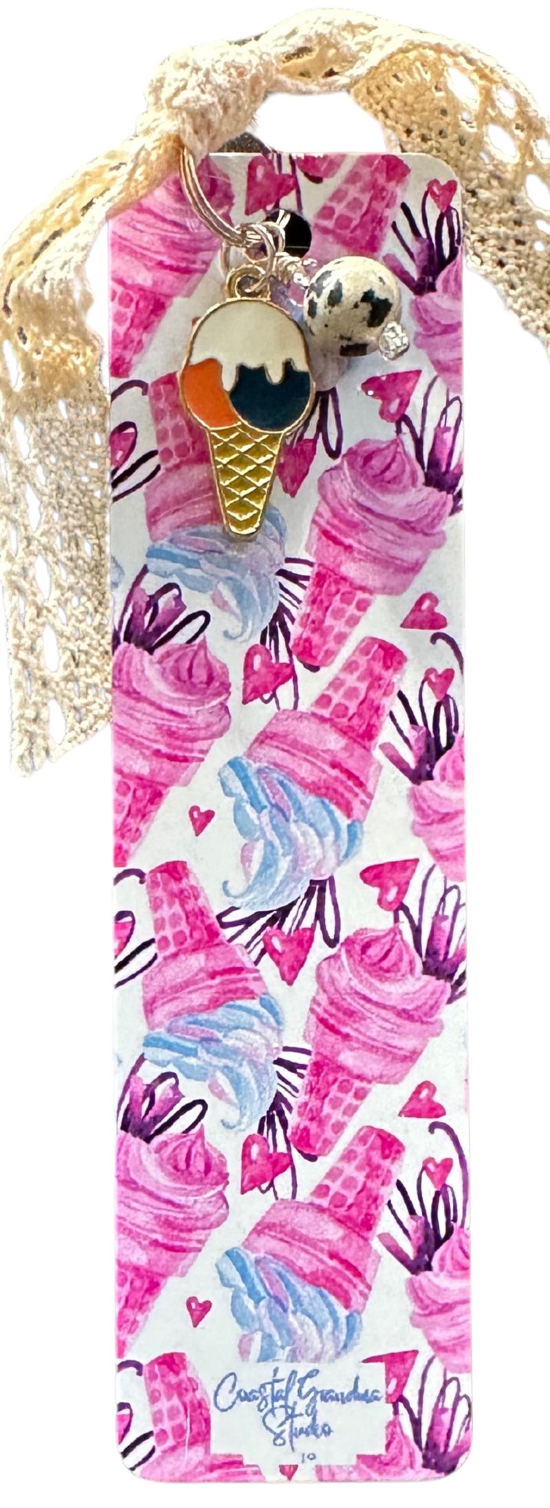 Ice Cream, You Scream! Lightweight Aluminum Bookmark With Vintage Lace, Charms & a Jasper Bead (1513-B)