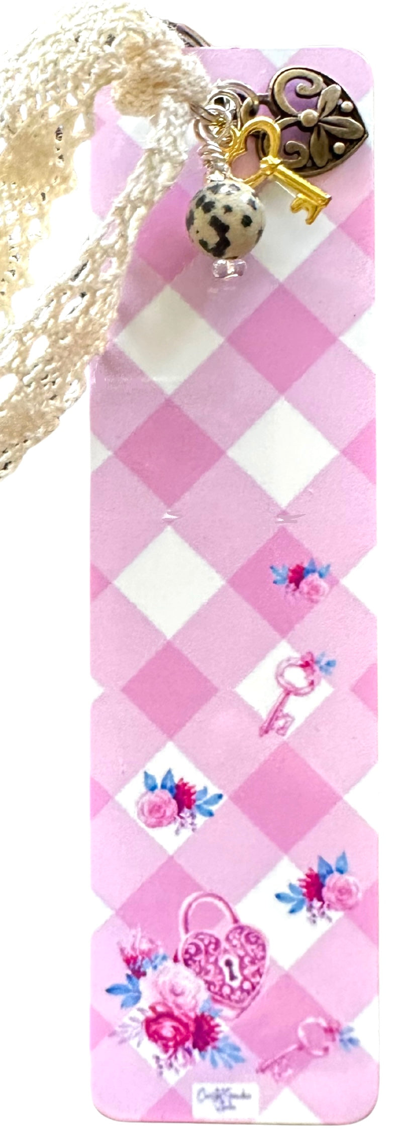 Fun, stylish and unique aluminum bookmark. Dainty lock and key charms and a Dalmation Jasper bead. Tied with a vintage-inspired cotton lace ribbon. 1.25" x 4.75"