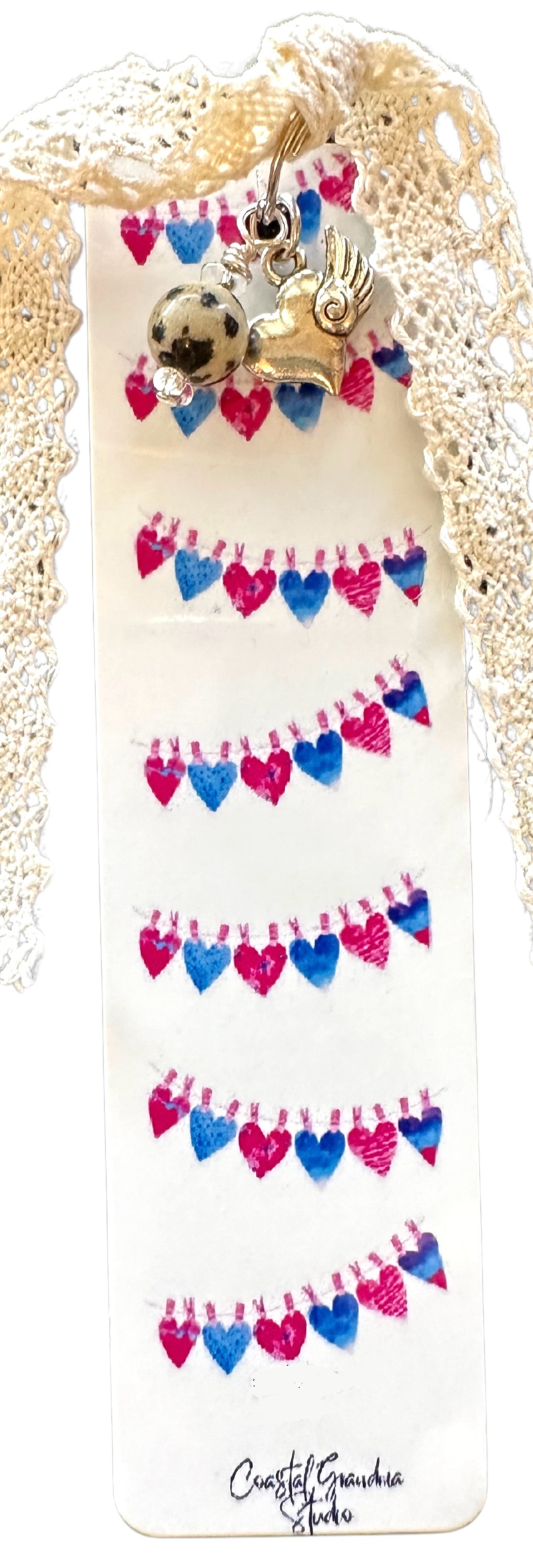 Rainbow Hearts! Lightweight Aluminum Bookmark With Vintage Lace, Charms & a Jasper Bead (1502-B)