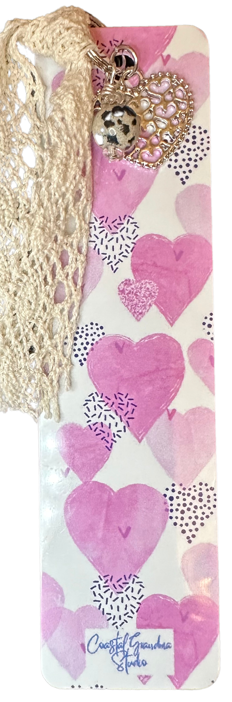 Soft Hearts! Lightweight Aluminum Bookmark With Vintage Lace, Charms & a Jasper Bead (1501-B)