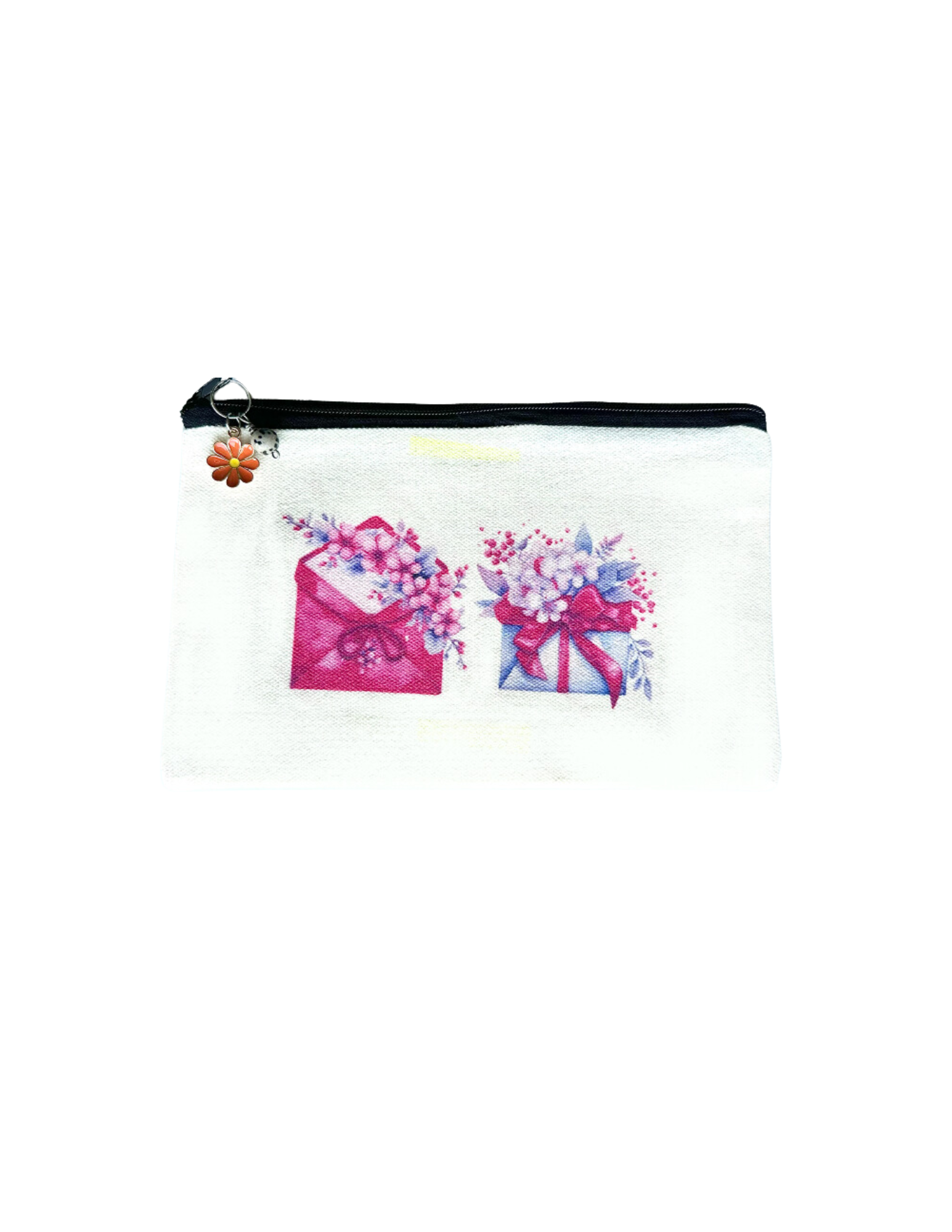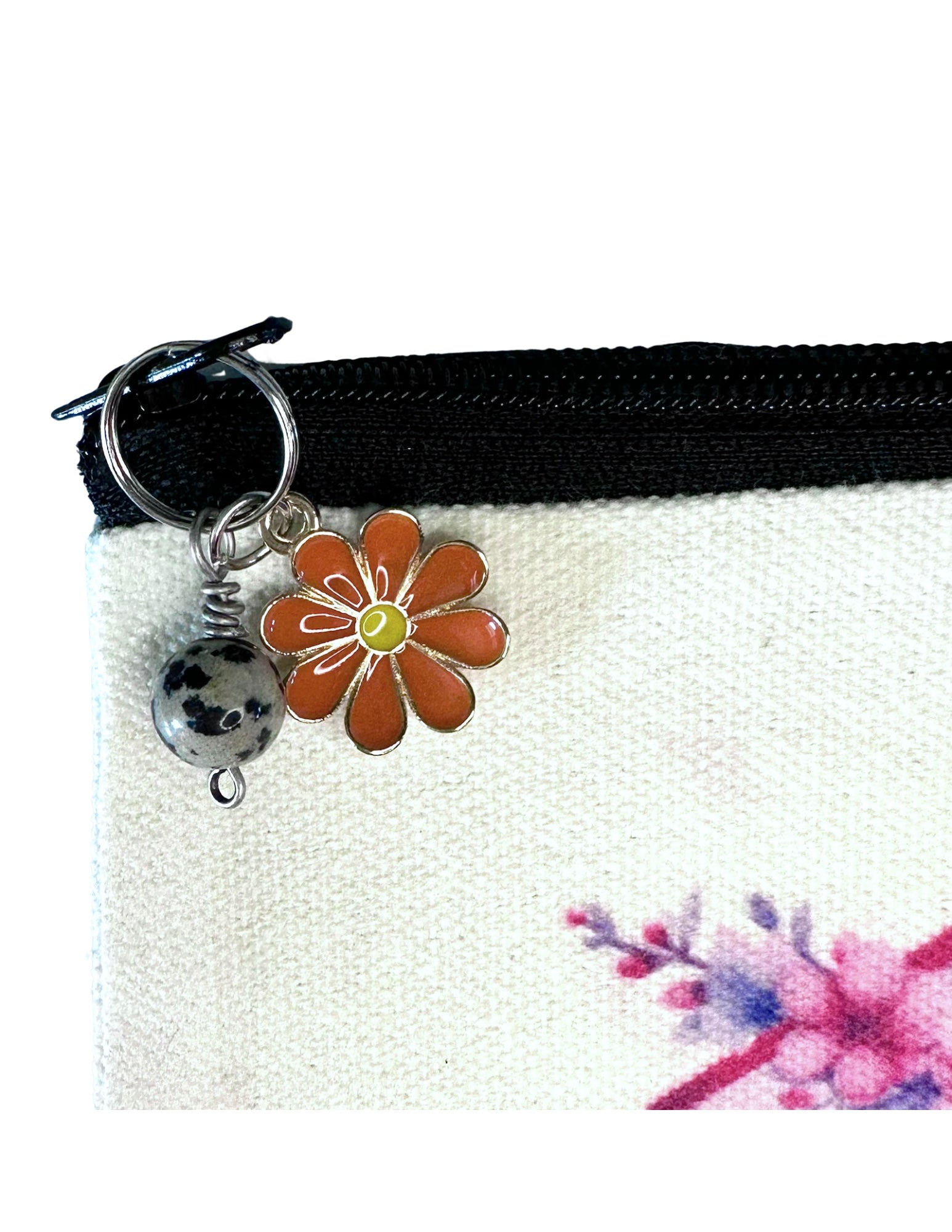 This fun cotton pouch is the perfect size to hold your pens, pencils, make-up, jewelry, stickers, bookmark collection, electronic gear for your phone/ipad...well, you get the picture, right?. I decorate each and every one in my studio, using the very same designs used on my phone cases, bookmarks, magnets, mugs, apparel, stationery, housewares, including coasters and tumblers! Each design has a charm and a Dalmation Jasper bead attached to the zipper pull The pouch measures 4.75" x 7.50" and closes with a tape zipper - not too big and not too small -- the Goldilocks of pouches!