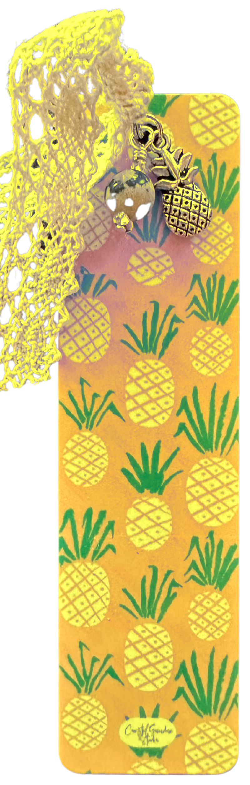 Fun, stylish and unique aluminum bookmark. Cheery pineapple charm and a Dalmation Jasper bead. Tied with a vintage-inspired cotton lace ribbon. 1.25" x 4.75"