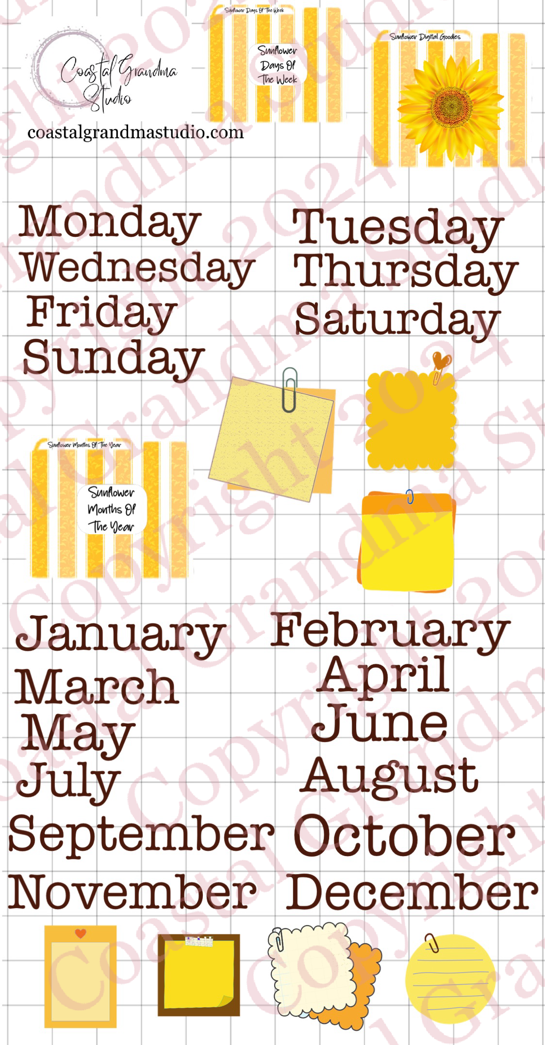 Sunflower! Days Of The Week/Months Of The Year Download Pre-Cropped Stickers For Goodnotes (4200-DM)