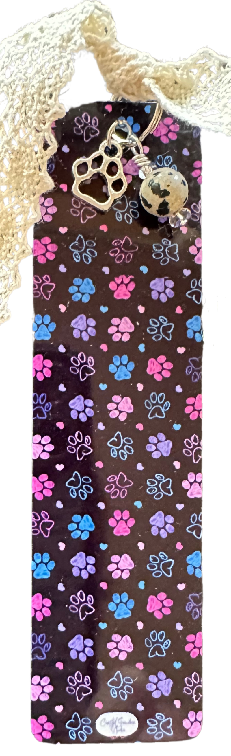 Fun, stylish and unique aluminum bookmark. Puppy paw charm and a Dalmation Jasper bead. Tied with a vintage-inspired cotton lace ribbon. 1.25" x 4.75"