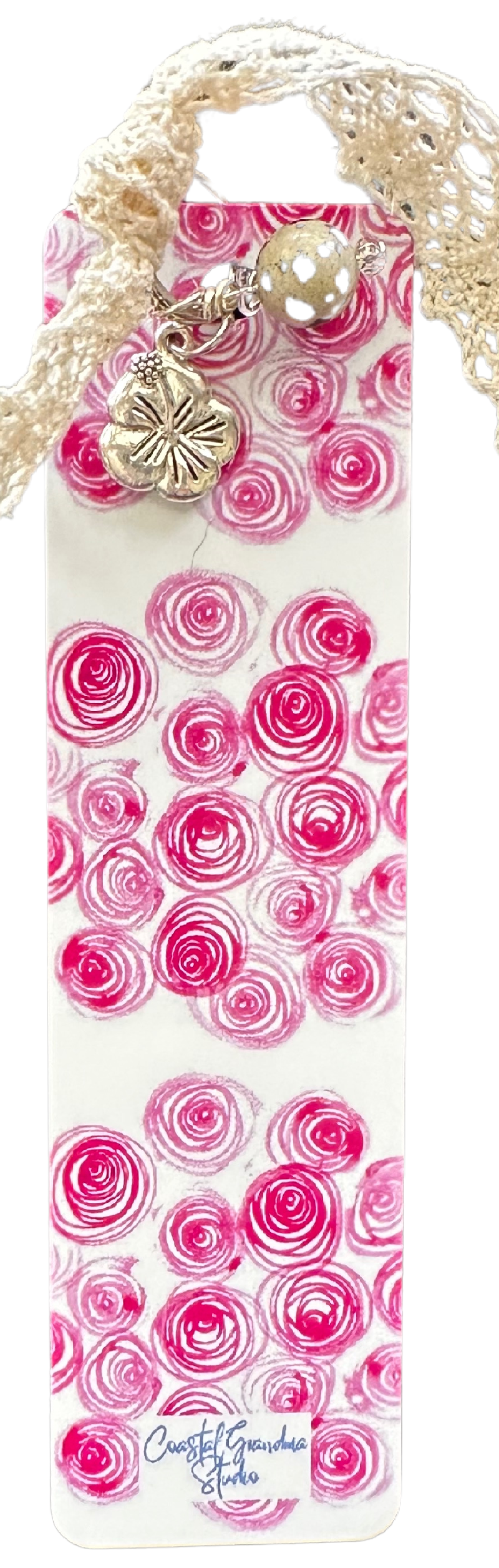 Fun, stylish and unique aluminum bookmark. Cheery flower charm and a Dalmation Jasper bead. Tied with a vintage-inspired cotton lace ribbon. 1.25" x 4.75"
