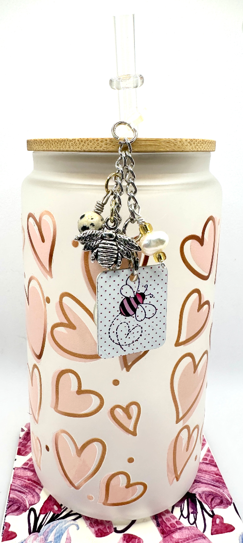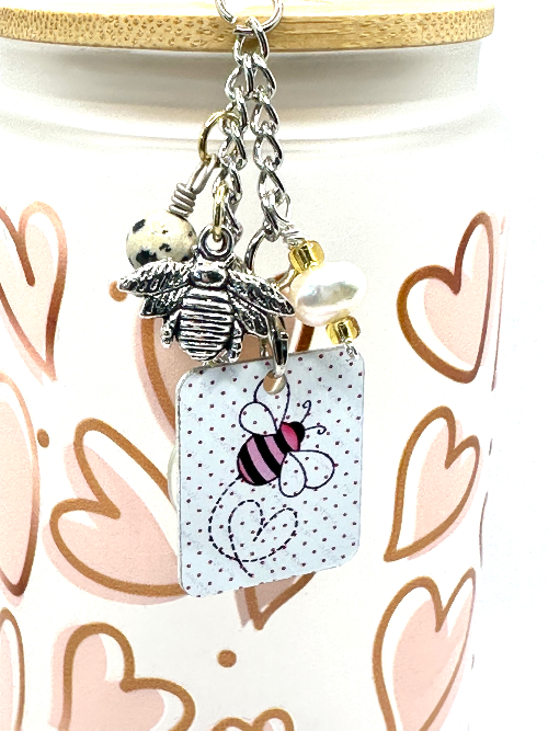 What's cuter than a cup/straw charm. How about a personalized cup/straw charm? Three inches of cuteness from top to bottom! Along with the main charm there is a honey bee charm, a freshwater pearl, a Dalmation Jasper bead and an iridescent glass bead. Spark joy every time you take a sip of your water. And...no second guessing whose cup is whose! Also makes a perfect "just because" gift for that special someone...just saying!