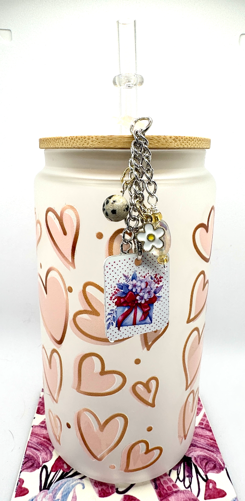 What's cuter than a cup/straw charm. How about a personalized cup/straw charm? Three inches of cuteness from top to bottom! Along with the main charm there is an enamel charm, a freshwater pearl, a Dalmation Jasper bead and an iridescent glass bead. Spark joy every time you take a sip of your water. And...no second guessing whose cup is whose! Also makes a perfect "just because" gift for that special someone...just saying!