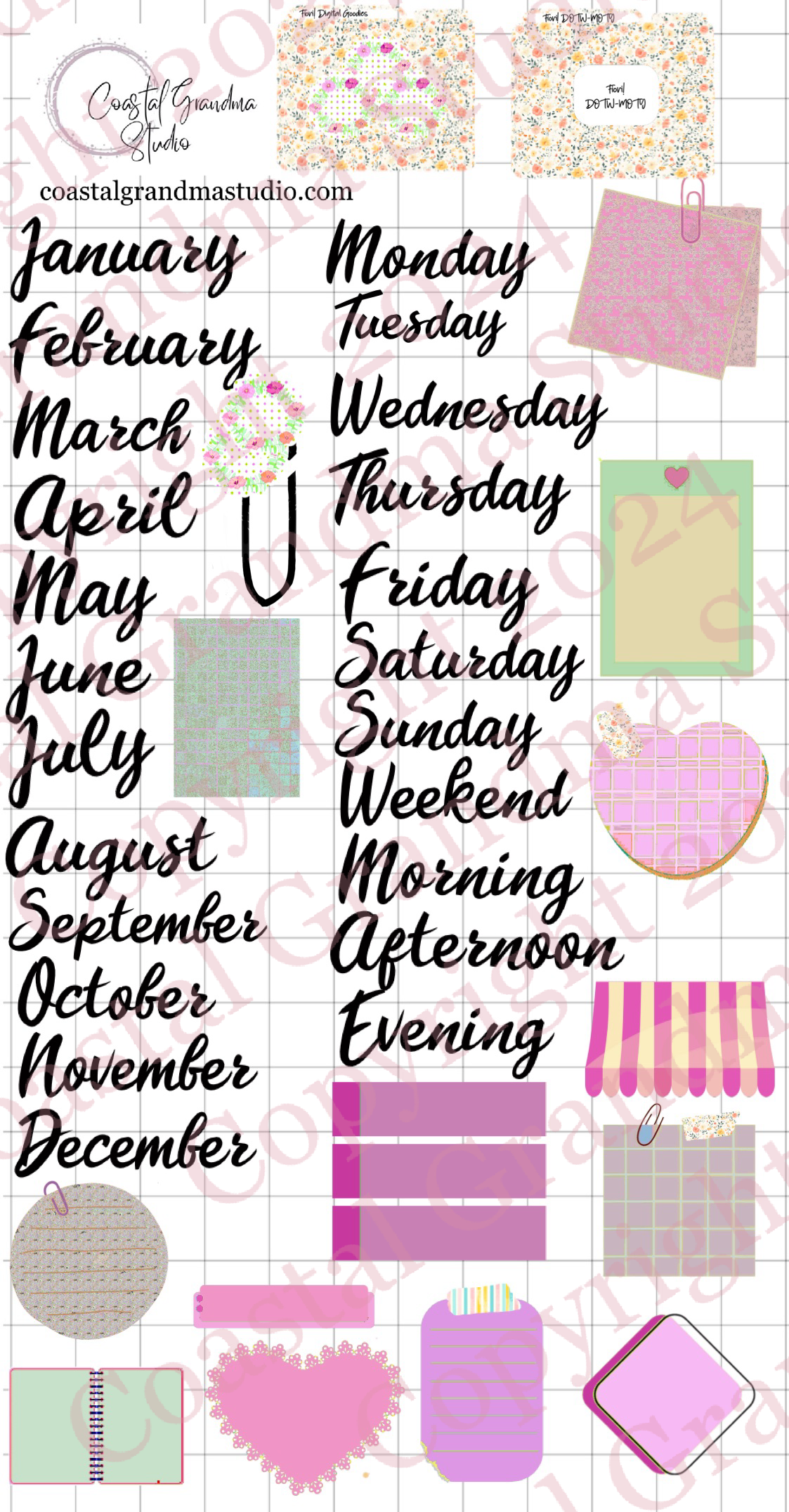 This file includes twenty three pre-cropped days of the week and months of the year stickers. I've also added a collection of deco-type stickers for you to have fun with in your digital planner. To help keep you organized there are two pre-cropped file folders for these stickers. (Be sure to subscribe to my You Tube Channel for suggestions on how you can use the file folders.)