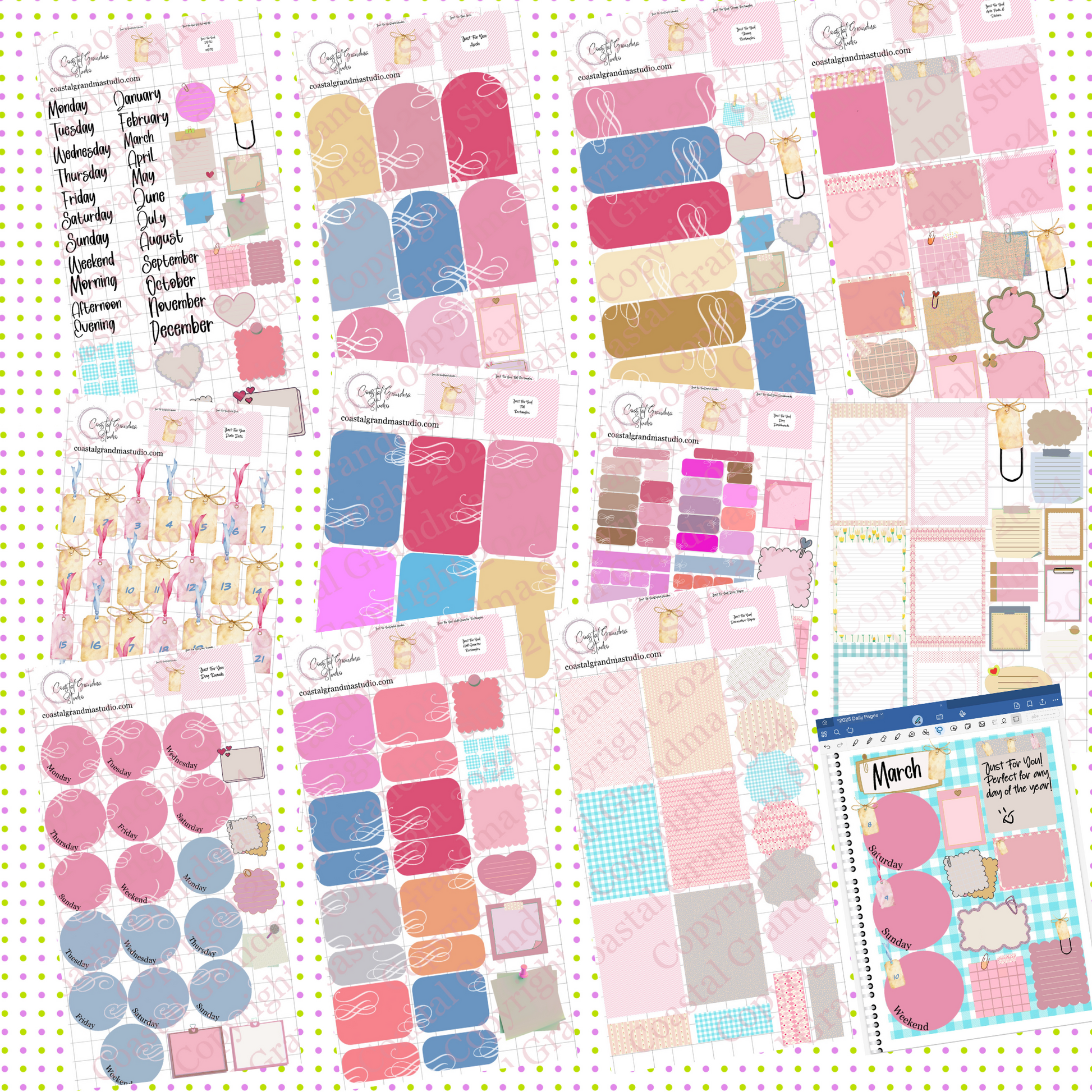 DETAILS: This BUNDLE includes all 12 of the Just For You! individual sheets of pre-cropped stickers. Specifically designed for use with the PDF annotation app GoodNotes. (Goodnotes is my APP of choice when it comes to all things digital planning and journaling.) When you buy the BUNDLE you save over what you would pay buying each one individually. And…unlike paper planners…these digital stickers never go out of date!