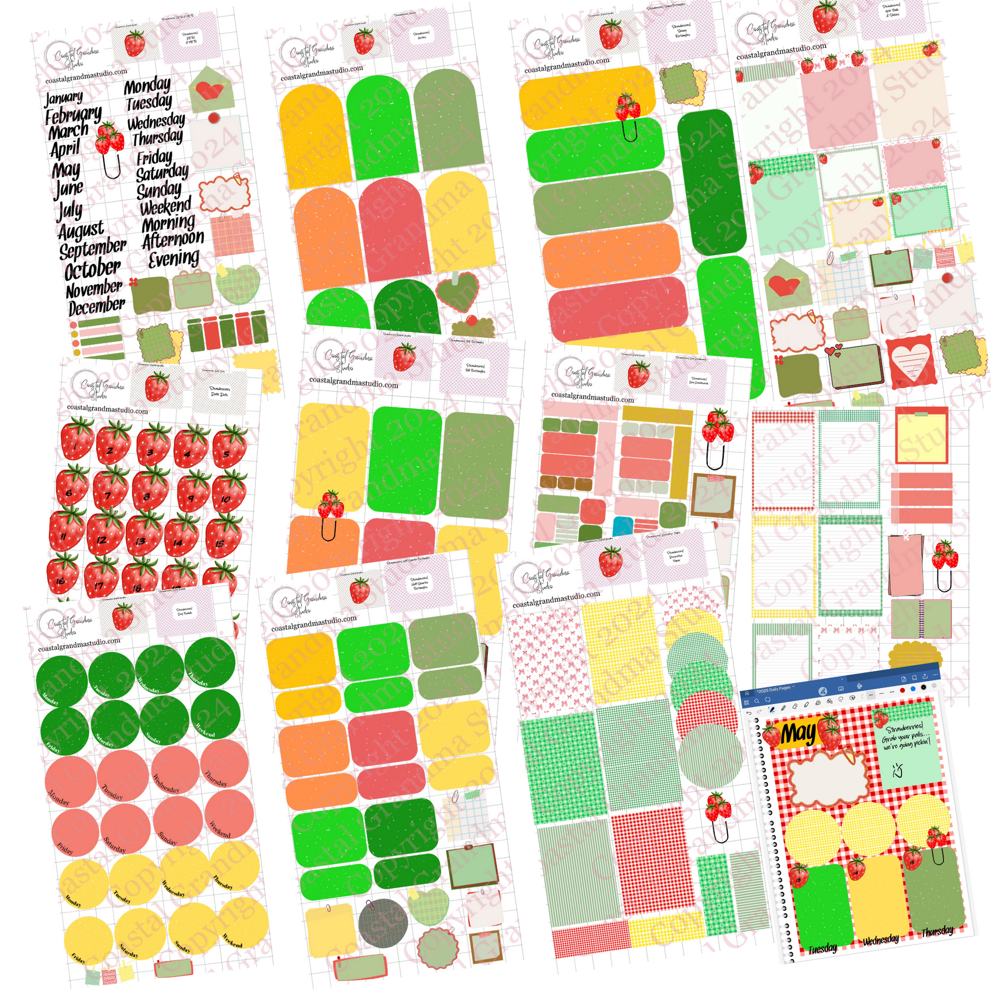 DETAILS: This BUNDLE includes all 12 of the Strawberries! individual sheets of pre-cropped stickers. Specifically designed for use with the PDF annotation app GoodNotes. (Goodnotes is my APP of choice when it comes to all things digital planning and journaling.) When you buy the BUNDLE you save over what you would pay buying each one individually. And…unlike paper planners…these digital stickers never go out of date!