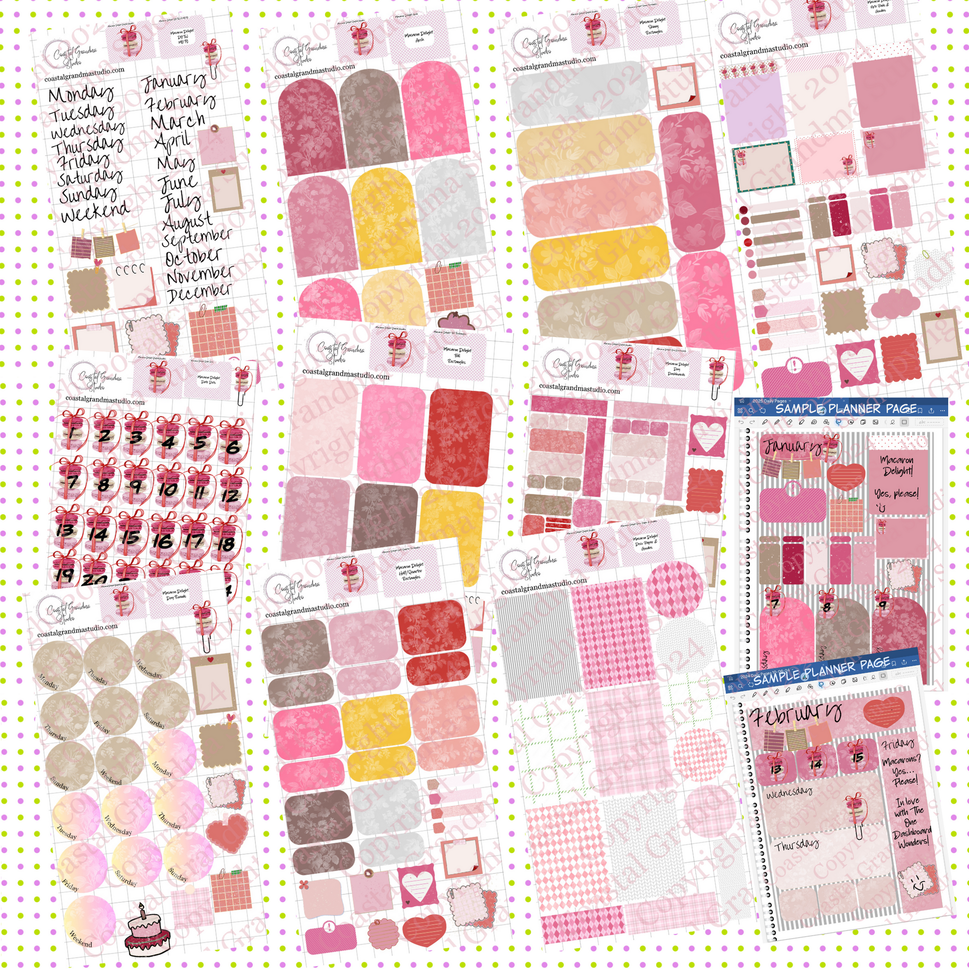 DETAILS: This BUNDLE includes all 12 of the Macaron Delight! individual sheets of pre-cropped stickers. Specifically designed for use with the PDF annotation app GoodNotes. (Goodnotes is my APP of choice when it comes to all things digital planning and journaling.) When you buy the BUNDLE you save over what you would pay buying each one individually. And…unlike paper planners…these digital stickers never go out of date!