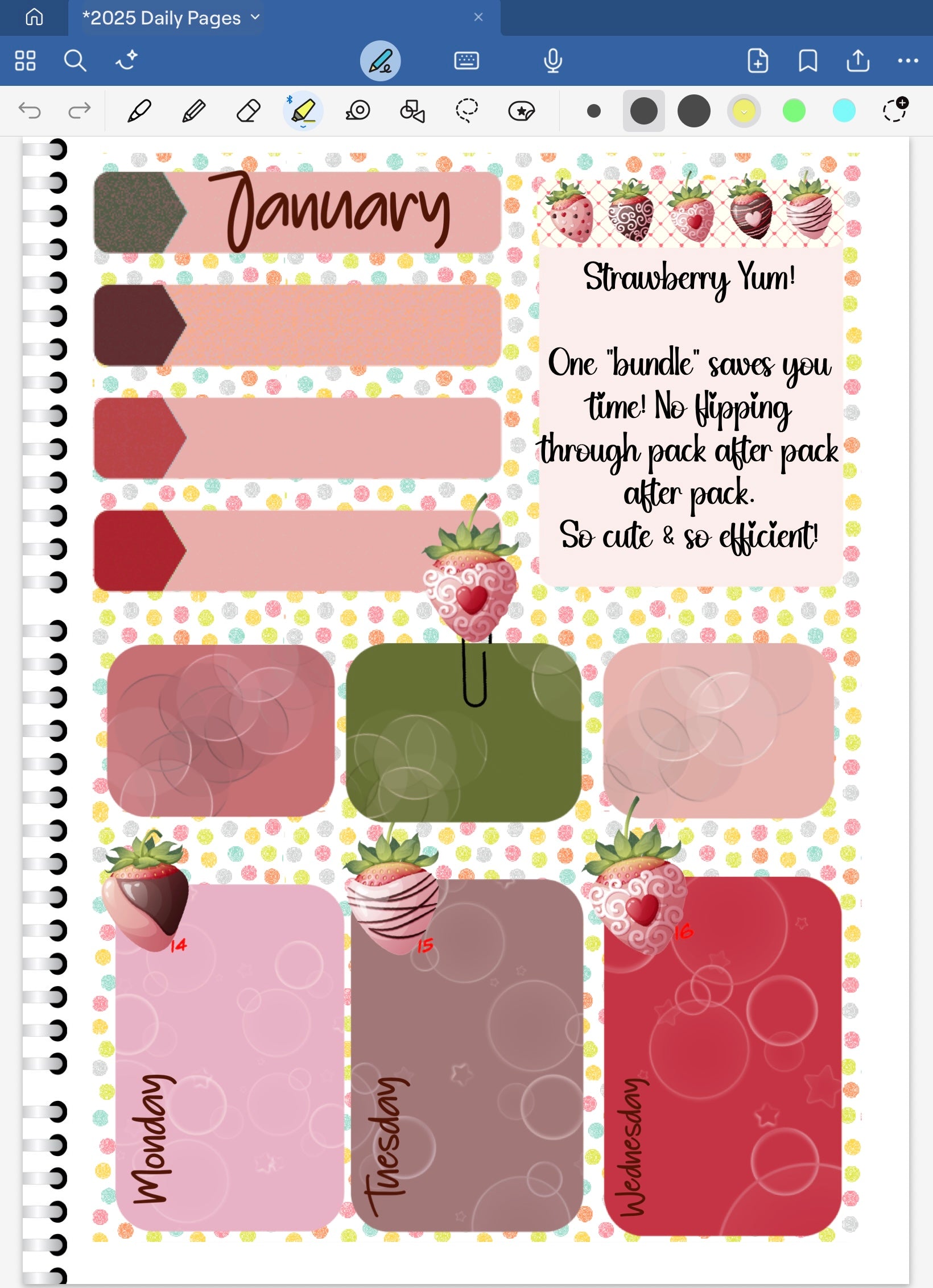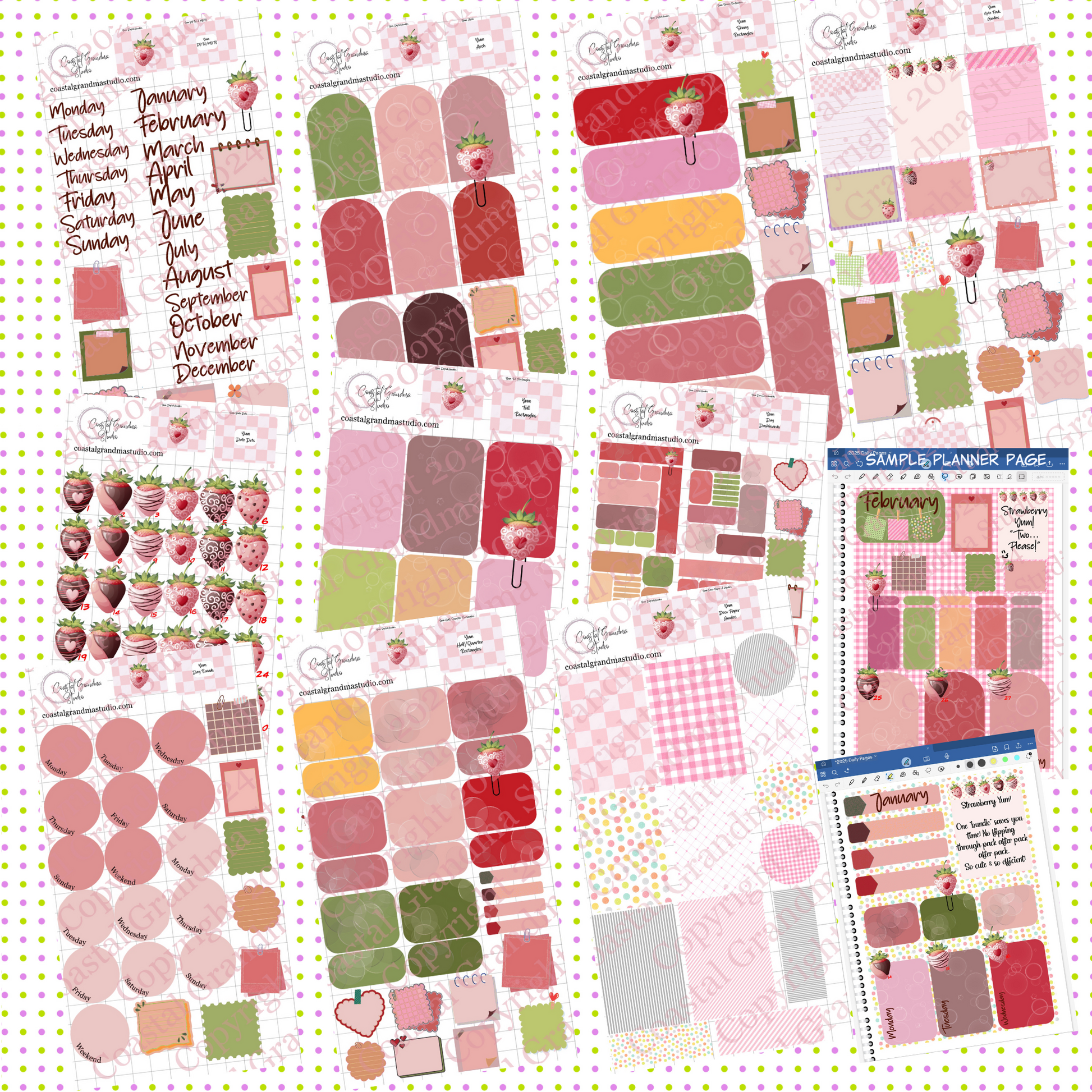 DETAILS: This BUNDLE includes all 12 of the Strawberry Yum! individual sheets of pre-cropped stickers. Specifically designed for use with the PDF annotation app GoodNotes. (Goodnotes is my APP of choice when it comes to all things digital planning and journaling.) When you buy the BUNDLE you save over what you would pay buying each one individually. And…unlike paper planners…these digital stickers never go out of date!