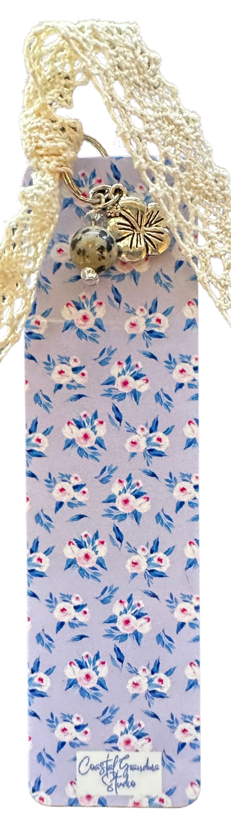 Fun, stylish and unique aluminum bookmark. Sweet flower charm and a Dalmation Jasper bead. Tied with a vintage-inspired cotton lace ribbon. 1.25" x 4.75"