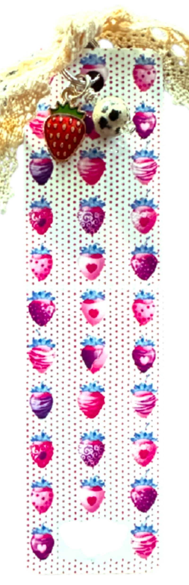 Fun, stylish and unique aluminum bookmark. Cheery strawberry charm and a Dalmation Jasper bead. Tied with a vintage-inspired cotton lace ribbon. 1.25" x 4.75"