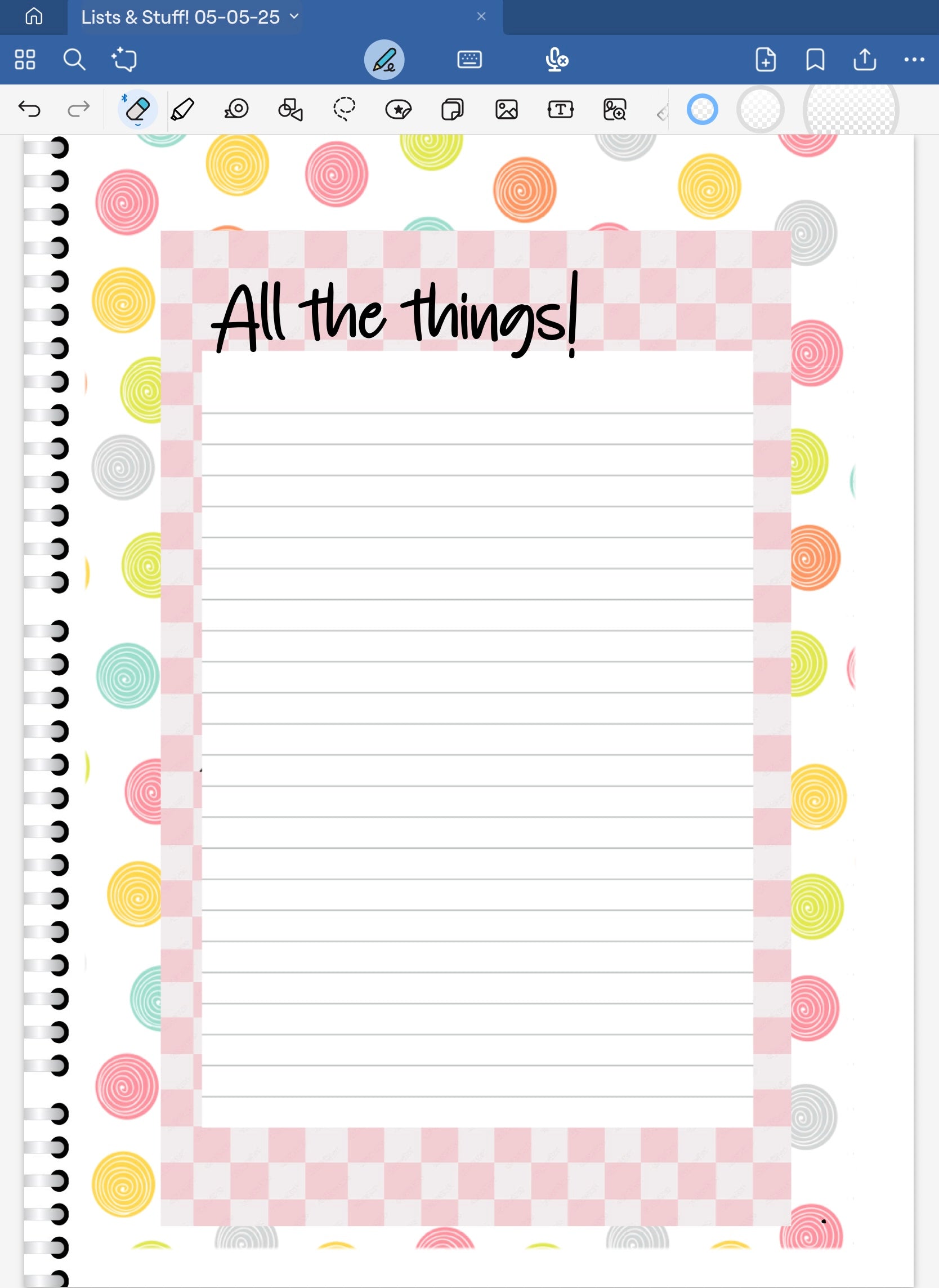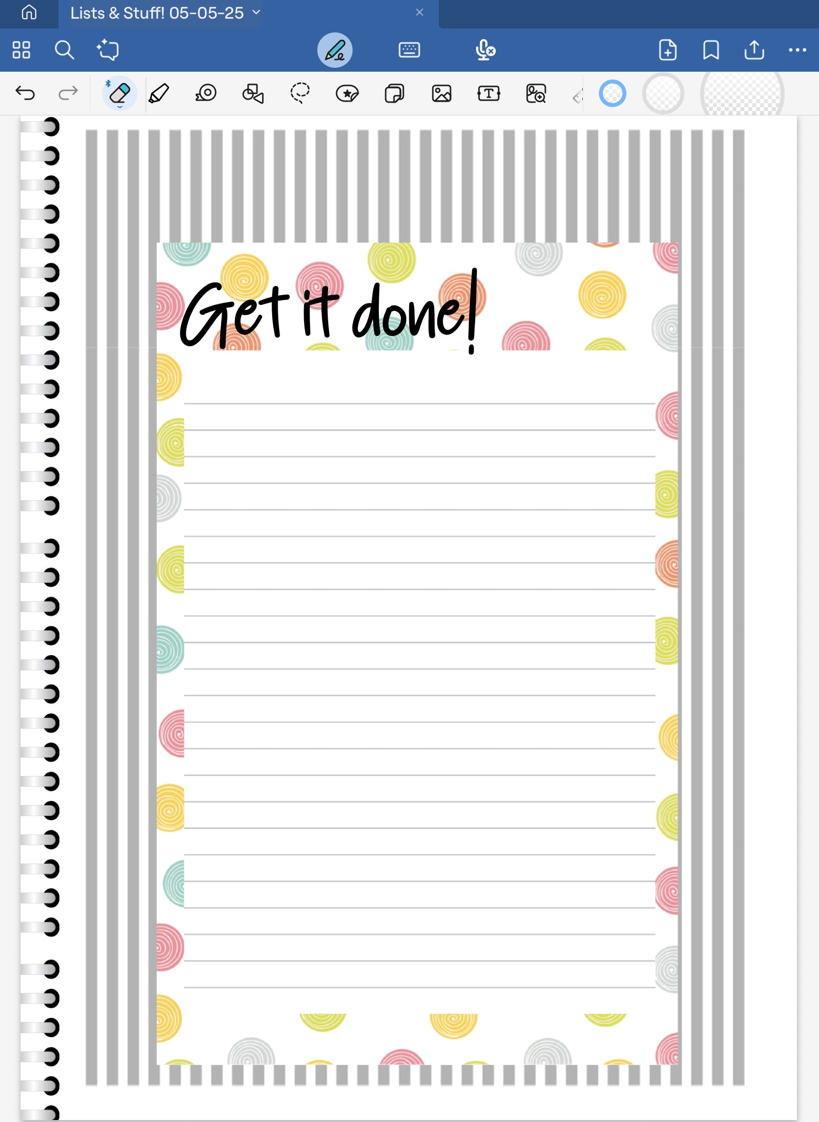 This file includes six pre-cropped lists that you can use in a variety of ways. (I added the headings using the Text Box tool.) Maybe you're like me, and some days you don't feel like creating a new page so a list comes to the rescue. It's quick and easy to jot things down and check them off as you complete each one. I keep a separate notebook in Goodnotes titled Quick Lists for jotting down thoughts that come to mind! Trust me...if I don't write it down immediately...it flies out of my brain as fast as it flew in! And, as always, I've also added two file folders to help you stay a wee bit organized. You'll also find a handful of fun decorative stickers.