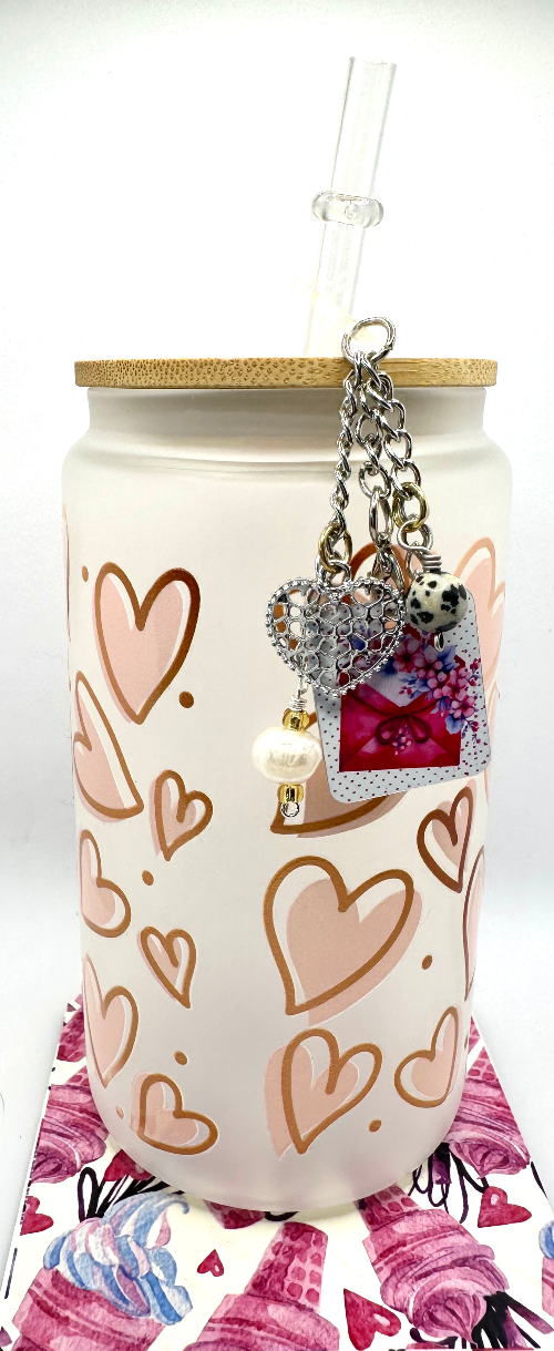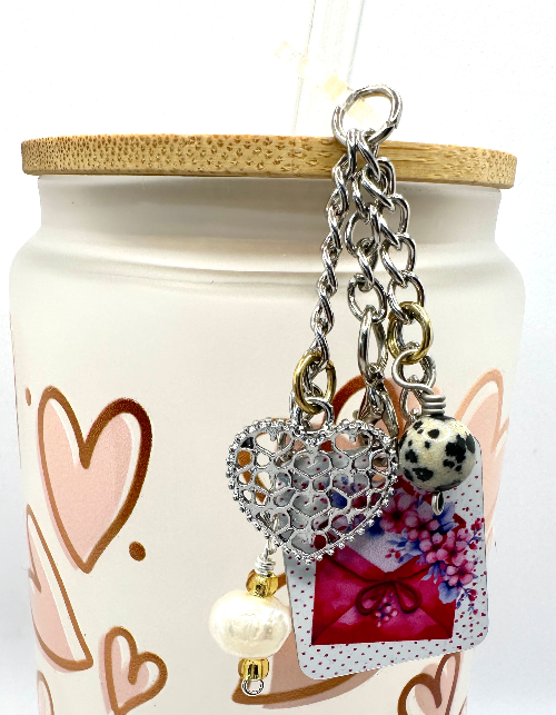 What's cuter than a cup/straw charm. How about a personalized cup/straw charm? Three inches of cuteness from top to bottom! Along with the main charm there is an enamel charm, a freshwater pearl, a Dalmation Jasper bead and an iridescent glass bead. Spark joy every time you take a sip of your water. And...no second guessing whose cup is whose! Also makes a perfect "just because" gift for that special someone...just saying!